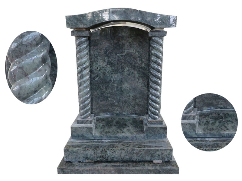 This is an classic memorial in green granite showing two hand carved columns effect depicting a rope design.